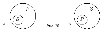 3. Подчинение. В суждении: «Все тигры – это хищники», – субъект «тигры» и предикат «хищники» находятся в отношении подчинения, потому что представляют собой видовое и родовое понятия (тигр – это обязательно хищник, но хищник не обязательно тигр). Так же в суждении: «Некоторые хищники являются тиграми», – субъект «хищники» и предикат «тигры» находятся в отношении подчинения, будучи родовым и видовым понятиями. Итак, в случае подчинения между субъектом и предикатом суждения возможны два варианта отношений: объём субъекта полностью включается в объём предиката (рис. 20, a), или наоборот (рис. 20, б).