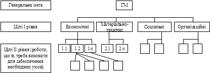 Для відображення цілей навіть дуже простої організації треба використати комплексний підхід, тобто створити систему цілей, яка б відбивала потреби підприємства з точки зору як зовнішнього, так і внутрішнього середовища. Розглядаючи це питання, можна орієнтуватися на різні підходи щодо ролі та значення підприємства у суспільстві. На рис. 4.5. подано два варіанти системної моделі цілей організації залежно від зазначених підходів. Залежно від концепції підприємства встановлюється генеральна мета, місія організації — суто економічна або соціально-економічного характеру. Для досягнення генеральної мети потрібно довести її зміст до кожного рівня та виконавця на підприємстві, визначити внесок кожного з працівників у стратегічний успіх підприємства взагалі. Це можна забезпечити за допомогою декомпозиції цілей та задач, тобто побудовою «дерева цілей», де встановлюються конкретні, виміряні задачі, що лежать в основі конкретних видів робіт. «Дерево цілей» — це наочне графічне зображення підпорядкованості та взаємозв'язку цілей, що демонструє розподіл загальної (генеральної) мети або місії на підцілі, завдання та окремі дії. «Дерево цілей» можна визначити, як «цільовий каркас» організації, явища чи діяльності. Загальний вигляд «дерева цілей» показано на рис. 4.6:
