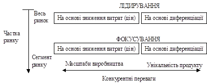 Запропоновані М. Портером у книзі «Стратегія конкуренції» (1980 р.) загальні конкурентні стратегії мають універсальний характер, оскільки, як показав час, підприємства, котрі сприйняли ці стратегії, досягли успіхів. Сутність стратегії можна відобразити у вигляді матриці (рис. 5.2) та в графічній формі. Тут також використовується поняття лідера, але більш ретельно досліджуються чинники, які його формують.