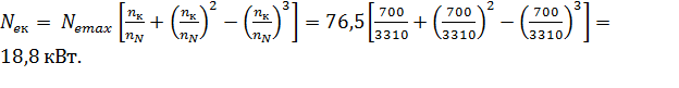 Для анализа работы автомобильных и тракторных двигателей используются различные характеристики: скоростные, нагрузочные, регуляторные, регулировочные и специальные. Обычно все характеристики получают экспериментальным путем. Скоростная характеристика показывает изменение мощности, крутящего момента, расходов топлива и других параметров от частоты вращения коленчатого вала. Скоростная характеристика, полученная при полном дросселе (карбюраторный двигатель), соответствующей номинальной мощности, называется внешней. На основании теплового расчета, проведенного для режима номинальной мощности, получены следующие параметры, необходимые для расчета и построения внешней скоростной характеристики 1. Эффективная мощность Ne = 76,5 кВт; 2.Частота вращения коленвала при максимальной мощности nN=3310 об/мин; 3.Тактность двигателя t = 4; 4.Литраж Vл = 2,7 л; 5.Ход поршня S = 86 мм; 6.Теоретически необходимое количество воздуха для сгорания 1 килограмма топлива l0 = 14,96 кг возд./ кг топл.; 7.Плотность заряда на впуске rк = r0 = 1,21 кг/м3; 8.Коэффициент избытка воздуха a = 0,96; 9.Удельный эффективный расход топлива gеN = 236 г/(кВт×ч) Расчетные точки скоростной характеристики. Принимаем: nmin = 700 об/мин; nx1-1350 об/мин; далее через каждые 650 об/мин и nN = 3310 об/мин. Значение эффективной мощности: