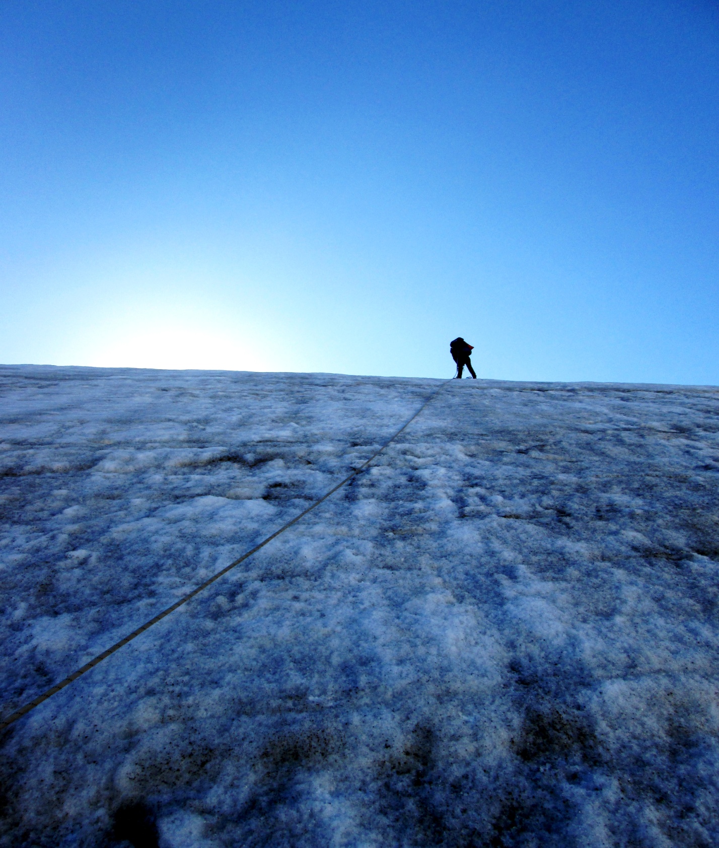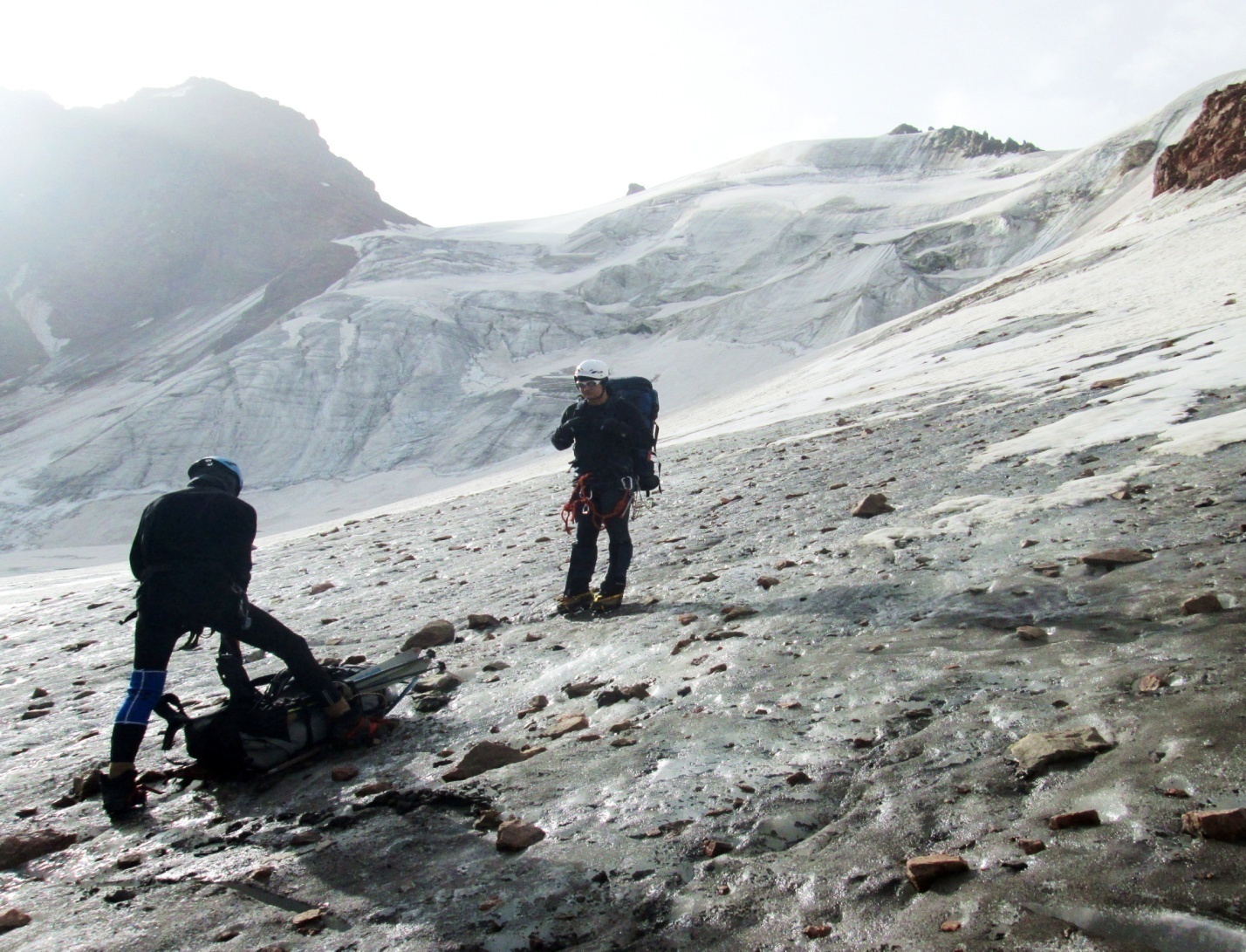Площадка для палатки Подойдя под перевал, перед нами красовался ледяной склон протяженностью 250-300 м. Пока было время четверо наших самых старших и опытных наши участника пошли вешать веревки. Тем самым наш руководитель лез первым, с двумя ледорубами и нижней страховкой, дойдя до определенного участка он вкручивал ледобуры, делал станцию для самостраховки участников, а также не большие полочки для более комфортной перестежки и тд. За два часа они сделали две станции и кинули две веревки для подъема. Место нашей ночевки находилось на высоте около 4000м из-за чего дышать было тяжело, группа уже акклиматизировалась и проблем с горной болезнью сильно не наблюдалось С отбоем затягивать не стали, так как подъем намечался на 4 утра, поэтому сразу после ужина все направились спать. Скажем так спать на такой каменной площадке не одно из самых приятных вещей, но немного погодя, я ни без труда но уснул. Дышалось все так же тяжело, а под вечер стало еще и холодно. Поэтому я теплыми словами вспоминал тренера когда он дал мне такой хороший пуховой спальник. Камнепад так же не давал спать, все раз за а разом грохоча своим взрывным звуком. День 7 Подъем как по расписанию произошел в 4:00, вне спальника было очень холодно совсем не хотелось, что-то делать. Одевшись как капуста я все таки решился выйти из палатки и сходить за едой, на этот раз была гречневая каша, чай и бутерброды. Чай особенно хорош в такое морозное утро. Через полчаса мы уже начали собираться, разбирать палатки и собирать рюкзак. Когда все собрались и были готовы, мы разобрали тактику кто как лезет и за что каждый должен отвечать. Моя роль в этом театре мечты была такая, а именно я должен был контролировать впереди идущего, д. Женю потому что он был не очень опытен, так же в мои обязанности входило успевать передавать веревку с ледобурами наверх, дабы не задерживать никого и не терять много времени на подъеме. После этого мы начали подъем на перевал в 5 утра.