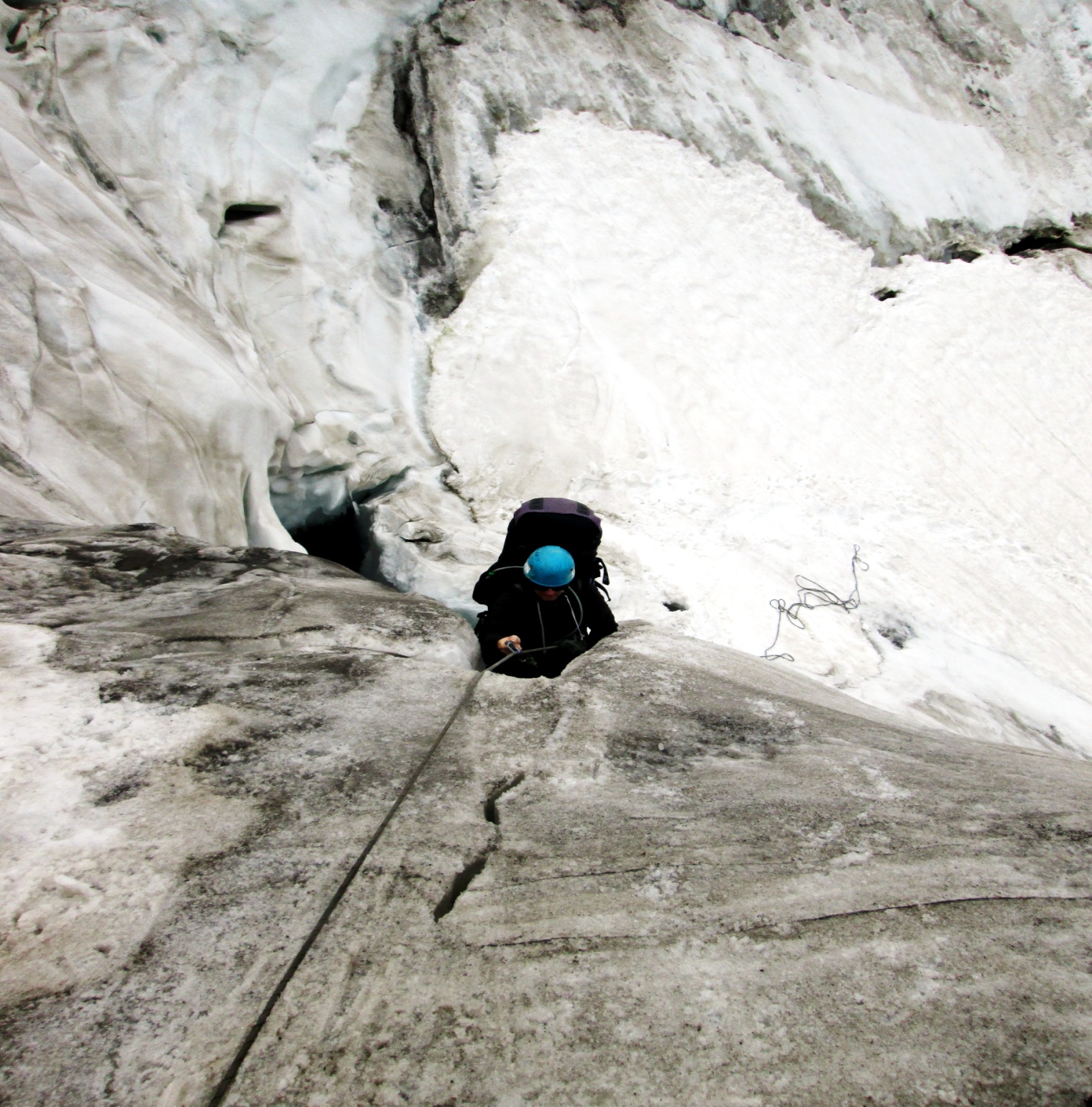 Ледник М. Маметовой У начала ледника мы переоделись, надели каски, обвязки, кошки, бахилы, сразу обвязались и пошли дальше, подъем предстоял не из легких…