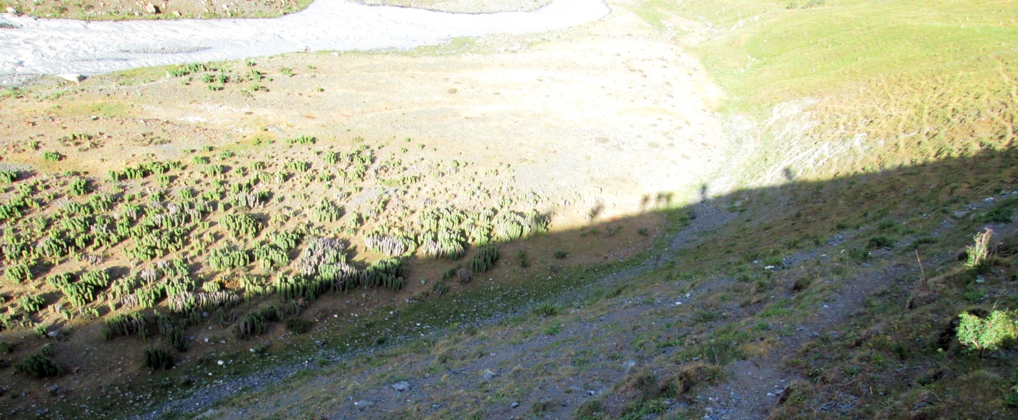 Спуск с перевала Рижский Дальше идём по цетру большого открытого ледника Чон-Аксу вниз вдоль глубокого жёлоба с мощным потоком. В месте, где берега жёлоба сходятся, перешагиваем на левый его берег и идём дальше вниз, спускаемся к окончанию ледника.Трайверсировать склон с осыпью было не очень охото и мы решили продолжить свое движение дальше по леднику. Но в итоге нам все равно пришлось выйти на осыпь и траверсировать склон у правого борта ледника в направлении характерной крупной рыжей осыпи. Осыпь устойчивая, иногда обходим обнажения конгломерата. Достигнув рыжей осыпи пошли траверсом по ней, язык ледника остаётся далеко внизу. Через 10 минут спустились по той же рыжей осыпи к грядке моренных холмиков, по которым выходим на уже на ровное поросшее травой пространство у правого борта долины. Там сделали долгожданный обед у первой чистой воды, ноги просто гудели, а погода поднимала настроение свои ясным небом и нежными лучами солнца. Последний переход вниз по долине, колючки, следы жизнедеятельности скота, множество ветвящихся троп, в конце спускаемся с высокого моренного вала по тропе, Находим ровную площадку на пологом травянистом склоне и встаём лагерем. Впереди луга, пасутся коровы, открывается широкая долина реки Чон-Аксу.