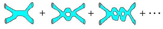 Как происходит взаимодействие струн. Две струны сталкиваются и аннигилируют, превращаясь во вспышку, которая представляет собой фотон и сама по себе является струной, колеблющейся в определённой моде. Таким образом, две исходные струны взаимодействуют между собой, сливаясь и образуя третью струну, как показано на рисунке ниже. Эта струна проходит некоторое расстояние, после чего выделяет энергию, полученную от двух исходных струн, разделяясь на две новые струны, которые продолжают движение.