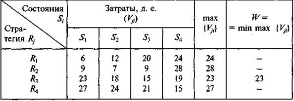 j i Пример 5. Рассмотрим пример 4. Так как Vij в этом примере представляет потери (затраты), применим минимаксный критерий. Необходимые результаты вычисления приведены в следующей таблице: Таблица 11-