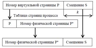 Обращение к памяти выполняется по следующей схеме. В случае если виртуальная страница присутствует в физической памяти, старшие биты виртуального адреса (Р) содержат номер виртуальной страницы. По таблице страниц устанавливается соответствующий адрес физической страницы. Он конкатенируется с младшими k разрядами виртуального адреса. Получается физический адрес. В случае если виртуальный адрес отсутствует в физической памяти (клетка ВП, содержимое располагается во внешней памяти) происходит страничное прерывание. Процесс переходит к ожиданию на системном объекте ядра, запускается процедура загрузки страниц, а контекст переключается на следующий готовый процесс. Для загрузки страниц определяется место в физической памяти. Если оно есть, то выполняется загрузка, коррекция таблицы страниц, перевод процесса в готовое состояние. В противном случае, выбирается страница для вытеснения. Если страница была модифицирована, то предварительно необходимо записать страницу на диск, иначе содержание страницы переписывается загружаемой страницей. Кандидаты на выгрузку определяются управляющей информацией операционной системы. Сегментный способ. При страничном распределении памяти адресное пространство делится механически на страницы равного размера. При сегментном распределении памяти размеры сегментов произвольны, сегменты снабжены атрибутами, определяющими способ их использования. Разделение программы на сегменты определяется программистом или компилятором. Атрибуты сегмента определяют способ его использования: для исполнения, чтения, записи. Также сегментное распределение позволяет разделять сегменты между процессами. В таблице сегментов указывается базовый адрес сегмента в физической памяти, а не номер, как в случае страничного способа. Размер сегмента не фиксирован, в отличие от страничного способа адресации. Он хранится в таблице сегментов и используется для контроля выхода за границы сегмента. Из-за разницы в размерах сегментов, как и в случае с динамическими разделами для сегментного способа управления памятью характерно явление фрагментации памяти. Сегментно-страничный способ. Цель сегментно-страничной организации памяти: решить проблему фрагментации физической памяти, сохраняя преимущество сегментного распределения, которое заключается в осмысленном распределении памяти.