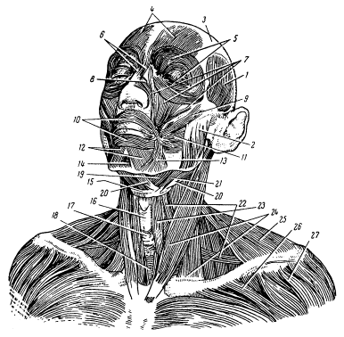 Рис. 3. Мускулы головы и шеи (вид спереди): 1 – височный мускул; 2 – жевательный мускул; 3 – сухожильный шлем (надчерепной апоневроз); 4 – лобные мускулы; 5 – круговой мускул глаза; 6 – пирамидальный мускул, «мускул гордецов»; 7 – квадратный мускул верхней губы; 8 – носовой мускул; 9 – скуловой мускул; 10 – круговой мускул рта; 11 – щечный мускул, «мускул трубачей»; 12 – квадратные мускулы нижней губы; 13 – треугольный мускул рта; 14 – подбородочный мускул; 15 – подъязычная кость; 16 – щитовидный хрящ (гортани); 17 – перстневидный хрящ (гортани); 18 – дыхательное горло; 19 – челюстно-подъязычный мускул; 20 – двубрюшный мускул; 21 – шило-подъязычный мускул; 22 – лопаточно-подъязычный мускул; 23 – грудино-подъязычный мускул; 24 – грудино-ключично-сосковый мускул; 25 – трапециевидный мускул; 26 – большой грудной мускул; 27 – дельтовидный мускул