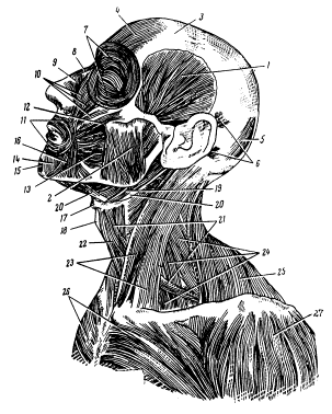 Рис. 4а. Мускулы головы и шеи (вид сбоку): 1 – височный мускул; 2 – жевательный мускул; 3 – «сухожильный шлем» (надчерепной апоневроз); 4 – лобный мускул; 5 – затылочный мускул; 6 – ушные мускулы (верхний и задний); 7 – круговой мускул глаза; 8 – пирамидальный мускул, «мускул гордецов»; 9 – носовой мускул; 10 – квадратный мускул верхней губы; 11 – круговой мускул рта; 12 – скуловой мускул; 13 – щечный мускул, «мускул трубачей»; 14 – квадратный мускул нижней губы; 15 – подбородочный мускул; 16 – треугольный мускул рта; 17 – подъязычная кость; 18 – выступ щитовидного хряща гортани (так называемый кадык, или адамово яблоко); 19 – шило-подъязычный мускул; 20 – двубрюшный мускул; 21 – лопаточно-подъязычный мускул; 22 – грудино-подъязычный мускул; 23 – грудино-ключично-сосковый мускул; 24 – лестничные мускулы; 25 – трапециевидный мускул; 26 – большие грудные мускулы; 27 – дельтовидный мускул
