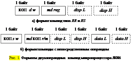 Форматы двухоперандных команд представлены на рис.1. Пунктиром показаны поля, которые в зависимости от режима адресации могут отсутствовать в команде.