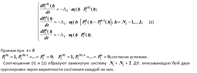 Постановка задачи Задача 1. В начальный момент текущая численность mi каждой i-ой (1,2) группировки полагается равно Ni. Каждая группировка производит выстрелы с плотностью Задача 2. В начальный момент времени текущее количество mij единиц каждого типа у каждой группировки полагается равным Nij. . Каждый тип единиц в составе каждой группировки производит выстрелы с плотностью Задача 3.. В начальный момент текущая численность mi каждой i-ой (1,2) группировки полагается равно Ni. Каждая группировка производит выстрелы с плотностью Теория