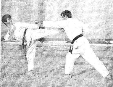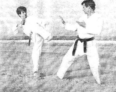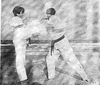 Отскакивающий метод Для того чтобы создать текучую комбинацию, которая называется нагаси вадза, не используйте сильное кимэ. В предыдущем примере, если вы уменьшите кимэ в конце удара ногой, то ваша стопа замедлит движение, но не остановится. И пока она будет продолжать двигаться по своей первоначальной траектории, позвольте своему телу развернуться вместе с ней. Затем, после поворота, вы легко сможете продолжить свой первый удар ударом маваси усирогэри, удар ногой с разворотом назад. Заметьте, как естественно первая техника перетекает во вторую. Эта процедура может использоваться для создания комбинаций техник во многих видах искусств. После того как вы отработаете их, применяйте их как санкайкавари. Начав с текучих техник, вы определенным образом настраиваете своего противника. После того как он увидит несколько ваших комбинаций, он поймет ваш стиль и сможет предугадывать, откуда будет направлена следующая техника. Когда вы почувствуете, что он готовится к контрдействиям, переходите к отскакивающему методу. Ваша вторая техника должна достичь цели, поскольку она будет направлена с неожиданной стороны. Опять же, как в предыдущем примере, ваш противник ожидал, что за вашим ударом мавасигэри Ваш противник уклоняется от вашего удара ногой и сокращает дистанцию: