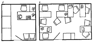 3.11. Детская комната в театрах для взрослых предназначается для пребывания детей дошкольного и младшего школьного возраста на время посещения родителями спектакля. В детской комнате рекомендуется предусматривать места для отдыха и игр, для педагога, а также санитарный узел. Площадь детской комнаты целесообразно определять из расчета 2,5 м2 на одного ребенка при количестве детей, равном 2% вместимости зрительного зала. 3.12. Площадь кабинета главного администратора рекомендуется принимать 12—25 м2, кладовой афиш — 4—6 м2, а комнаты распространителей билетов — 6—10 м2 в зависимости от значимости театра (см. рис. 5). При этом кабинет или комнату рекомендуется проектировать смежно с кабиной дежурного администратора и с входом в нее. Двери из кабинета главного администратора и комнаты распространителей билетов рекомендуется устраивать ведущими в тамбур или отрезок коридора, сообщающийся с одним из вестибюлей. В театрах большой вместимости возможно проектировать отдельное помещение для второго администратора, рабочее место которого во всех прочих случаях может находиться в комнате распространителей билетов. 3.13. Фойе рекомендуется организовывать по принципу дифференциации пространства, членя его на зоны для тихого и активного отдыха. Зоны тихого отдыха размещают вне направлений активного движения и выделяют различными архитектурными средствами, создавая интимные пространства. Зоны тихого отдыха рекомендуется оборудовать креслами, диванами, банкетками из расчета на единовременное пользование 8-10% зрителей (рис. 7). Зону для активного отдыха также рекомендуется расчленять, устраивая залы и протяженные пути перемещения. Распространенными способами зонирования являются зелень, мебель, дизайнерское решение, перепады уровней потолка и пола, световая и цветовая композиция и пр.