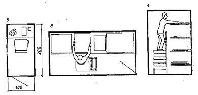 Рис. 5. Примеры планировки административных помещений при зрительском комплексе а - кабинет главного администратора; б - помещение администратора; в - кабина дежурного администратора; г - комната распространителей билетов; д - кладовая афиш, план; е - кладовая афиш, разрез