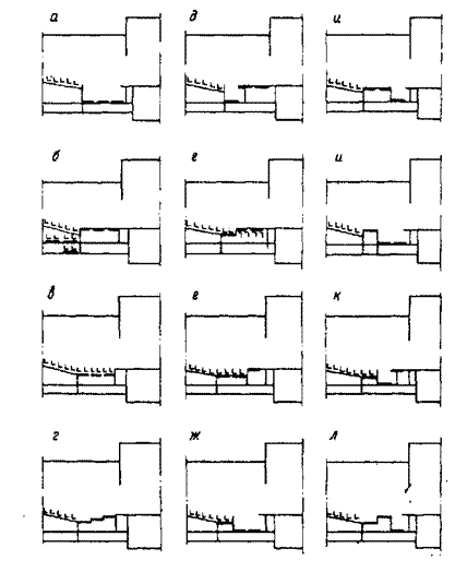 Рис. 15. Трансформации оркестровой ямы (с тремя подъемно-опускнымм площадками) а - и — см. рис. 14; к — увеличение глубины авансцены и вместимости зрительного зала с устройством оркестровой ямы; л - устройство ступенчатого спуска с авансцены в зрительный зал