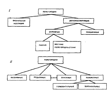 Рис. 18. Основные средства пространственной трансформации I - виды перегородок; II - способы установки и съема перегородок; III -звукоизолирующие перегородки (а - гибкие перегородки; б - жесткие перегородки-сцены; в - секционные перегородки)