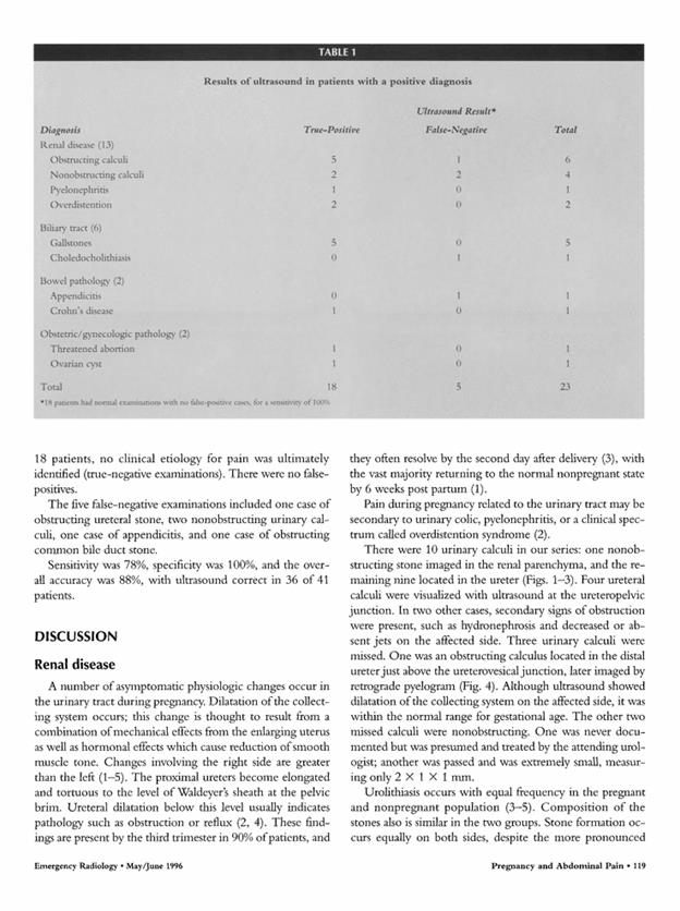 JMAJ 44(11): 496–500, 2001 Shingo KAMEOKA* and Shinpei OGAWA** Professor* and Assistant Professor**, Department of Surgery II, To k yo Women’s University School of Medicine Abstract: The diagnosis and important aspects in treating acute abdomen tend to be delayed due to the peculiar physiological features of pregnancy and the restrictions imposed on image diagnostic techniques such as x-ray and CT. Physi- cians should pay attention in this regard as any delay may seriously deteriorate the condition of both mother and fetus. Detailed questioning of the patient and abdomi- nal findings, especially information obtained by palpation, are considered essential in making a diagnosis and determining proper treatment. Ultrasonography is non- invasive to both the mother and fetus and is useful for diagnosing illness during pregnancy, including acute abdomen, acute appendicitis, and ileus. In treating the pregnant patient, high priority should be placed on improving the patient’s condition and determining the necessity of surgery. Rather than postpone the decision to opt f or surgery, the physician in charge is advised to seek additional professional opinions and enlist the support of other surgeons in order to arrive at earlier diagnosis and treatment. Key wo r ds: Acute abdomen; Pregnancy sible influences on the fetus have to be taken into consideration in the treatment of acute abdomen in pregnancy. Because of the preg- nancy, restrictions are imposed on image diag- nostic techniques such as x-ray and CT. Due to these considerations and restrictions, delay in diagnosis and treatment could lead to a serious condition in both the mother and fetus. Thus, prompt and appropriate decision-making and subsequent treatment are needed. T his paper addresses approaches to accurate diagnosis and the important aspects in the treat- ment of acute abdomen in the field of surgery. Introduction Acute abdomen is a general term for “acute abdominal diseases accompanied primarily by sudden abdominal pain for which a decision to perform emergency surgery must be made in a very short time”. 1) Causes of acute abdomen in pregnancy include ectopic pregnancy, pedun- cular torsion of an ovarian cyst, ovarian bleed- ing, and pelvic inflammation. 2) However, it may also be caused by such illnesses as acute appen- dicitis, ileus, and cholecystitis. 3) T he specific physiological features of the mother and pos- JMAJ, November 2001—Vol. 44, No. 11 A CUTE ABDOMEN IN PREGNANCY Acute Abdomen in Pregnancy Acute abdomen in pregnancy may be caused by various illnesses not related to pregnancy. According to Inoue et al. , appendicitis accounts for 70.1% (including 10% complicated with per- forating peritonitis) of the diseases that cause acute abdomen, followed by ileus (21.0%), peduncular torsion of ovarian cyst (5.3%), and acute cholecystitis and cholangitis (3.6%) ( T able 1) . 3) Acute pancreatitis 4) and ureterolith, 5) wh ich also cause acute abdomen, are conservative treatment cases. Approaches to Diagnosis 1. Auscultation T he symptoms observed in acute abdomen are often similar to digestive symptoms associ- ated with pregnancy. In this regard, detailed questioning of the patient is necessary. The major symptom of acute abdomen is abdomi- nal pain. As a first step, the causative disease should be determined on the basis of the site and characteristics of the abdominal pain as well as what the patient has eaten. Sudden, vio- lent pain is characteristic of such occurrences as digestive tract perforation, mesenteric artery embolism, and ureterolith. Acute appendicitis starts with the pain and discomfort in the upper abdomen, which localizes in the lower right abdomen (the site later moves upward, corre- sponding to the gestational cycle). Acute chole- c ystitis and acute pancreatitis frequently occur after eating rich food. Information on associ- ated symptoms, and descriptions of stools, as well as the patient’s medical history are also helpful for diagnosis. If there is a post-surgical history and severe vomiting, ileus can be sus- pected. Tarry stools suggest the perforation of a duodenal ulcer. Bloody stools may indicate ischemic colitis or mesenteric artery embolism. Similar symptoms may have occurred several times in the past, in the case of acute cholecys- titis, due to gallstones. 2. Physical findings Abdominal findings, particularly those ob- tained by palpation, are indispensable for both diagnosis of the causative disease and deter- mining proper treatment. Decisions to conduct emergency surgery or opt for conservative treat- ment, by placing the patient under observation, should be made on the basis of symptoms such as peritoneal irritation. Even if the laboratory test findings indicate no abnormalities, celio- tomy should often be conducted when the peri- toneal symptoms are severe. The Blumberg sign and muscular defense are important findings based on which the causative disease, the sever- ity and the extent (localized or diffuse) of peri- T able 1 Acute Abdomen Complications in Pregnancy in the Past 19 Years (1973.1 1991.12) Disease / Case Number of cases (%) Age (mean age) Acute appendicitis 40 (70.1) [ 35 years old (25.2) Ileus 12 (21.0) [ 40 years old (29.4) [hernia impaction] [ 8 (14.0)] [22 39 years old (29.4)] Peduncular torsion of ovarian cyst 3 (5.3) [ 34 years old (28.5) Acute cholecystitis, cholangitis 2 (3.6) 38, 39 years old (38.5) T otal 57 (100.0) [ 40 years old (26.7) (Inoue, M. et al. , “Acute abdomen during pregnancy.” Progress of abdominal emer- gency treatment, 1992; 12: 900) JMAJ, November 2001—Vol. 44, No. 11 Fig. 1 Ultrasonography of acute appendicitis Swollen appendix () and abscess () in the periphery tonitis can be determined with reference to the site of most severe pain. Diagnosis is often made more difficult during pregnancy due to the deviation of organs caused by an enlarged uterus and relaxation of the abdominal wall. It is a well-known fact that the position of