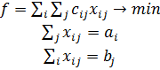 1. Находится клетка с наименьшей стоимостью перевозки. Туда ставится максимально возможный груз ( 2. Затем находится следующая клетка с наименьшей стоимостью – заполняется аналогично. Так же как и методе северо-западного угла, если на каком-то этапе одновременно вычеркивается и ПО, и ПН, то ставится 0 – вырожденное решение. Если при нахождении некоторого базисного решения методом наименьшей стоимости есть несколько клеток с наименьшей стоимостью, выбрать ту, куда можно привезти больше всего груза.