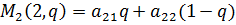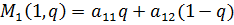 То есть, цена игры находится между нижней ценой игры и верхней ценой игры. 30. Графическое решение игры в случае наличия у одного из игроков двух чистых стратегий. Если у одного из игроков имеется только две стратегии, то игру можно решить графическим методом (найти смешанные оптимальные стратегии и цену игры). У кого две стратегии – тот экстремум внешний. 1) Определяем максимин и минимакс. Цена игры лежит между этими числами. 2) Две стратегии игрока раскладываем в виде 3) Определяем выигрыши первого игрока, когда он применяет свою смешенную, а второй свои чистые стратегии.