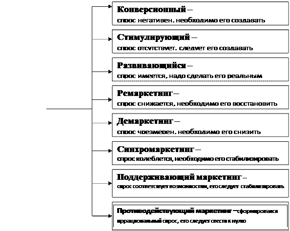 Управление маркетингом – искусство и наука выбор целевых рынков и налаживания выгодных отношений с покупателями на них. К управлению маркетингом относится приобретение, удержание и развитие покупателей, для чего компания создает высшую потребительскую ценность, предоставляет ее покупателям и распространяет информацию о ней. Другими словами управление маркетингом подразумевает управление спросом, которое в свою очередь предполагает управление отношениями с клиентами. Уровень спроса на продукцию компании должен быть таким, какой желателен для нее. Компания может столкнуться со значительными колебаниями спроса: он может упасть до нуля или вырасти очень сильно, стать нерегулярным и т.п. Управление маркетингом как раз призвано разработать схемы действия компании при разных уровнях спроса на ее продукцию. При этом управление маркетингом может быть направлено не только на рост спроса, но и на его корректировку и даже снижение. В качестве примера рассмотри парк. Летом, на пике посещаемости, парк не в состоянии принять всех желающих – ведь самый большой наплыв посетителей приходится на дождливую погоду, когда все отдыхающие уходят с пляжей в парк. В такие периоды избыточного спроса основной задачей маркетинга становится демаркетинг – маркетинг, направленный на временное или постоянное снижение спроса. Цель демаркетинга не в том, чтобы убрать спрос, а лишь в том, чтобы снизить или сместить его. Управление маркетингом должно влиять на уровень, периодичность и природу спроса таким образом, чтобы компания достигла своих целей. Попросту говоря управление маркетингом – это управление спросом.