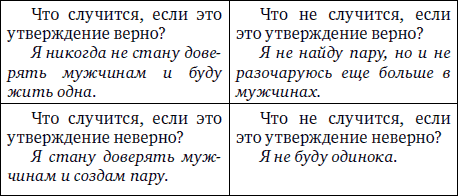 Дальше, для определения последствия использования данного убеждения, я предложила Светлане заполнить логический квадрат, включающий следующие вопросы. Что случится, если это утверждение верно? Что случится, если это утверждение неверно? Что не случится, если это утверждение верно? Что не случится, если это утверждение неверно?