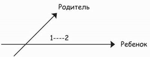 Используемые нами измерения имеют политические последствия. Когда Эйнштейн предложил четырехмерное пространство-время, никто ни хотел его слушать. Физики думали, что он воображает нереальные вещи. Даже в недавнее время, когда Стивен Хоукинг говорил об измерениях «мнимого времени», описывающих первые мгновения существования Вселенной, многие считали его выводы слишком умозрительными. Но Эйнштейн и Хоукинг были не первыми, кто использовал для описания мира четыре измерения. И раньше люди описывали Вселенную, используя четыре или больше измерений. Китайцы, коренные жители Америк, в том числе майя и инки, а также многие дохристианские культуры использовали для описания космоса четверичные структуры3. Если для представления «мироздания» можно использовать четыре измерения, то все меньшее четырех что-то упускает. На самом деле, любое небольшое число измерений не учитывает другие. Например, подумаем о психологическом примере двухмерного мира. Возьмем кого-либо, находящегося в такой фазе, когда он или она думает только о своем недоброжелательном родителе и о себе как обиженном ребенке. Все движения в этом двухмерном мире происходили бы в своего рода плоской стране. Мы можем думать о диаграмме, приведенной ниже, как о плоском листе бумаги на плоском столе. Там есть длина и ширина, но нет высоты. Положение любой точки в этой плоской стране (как на листе бумаги) можно определять, говоря о достоинствах и недостатках родителя и ребенка. Любой маршрут из точки 1 в точку 2 в двухмерном мире остается на листе бумаги. На рис. 22.3 все, что бы вы ни делали, можно определить в терминах родителя и ребенка. Ваше состояние в плоской стране весьма просто: вы зрелый или инфантильный, взрослеющий или регрессивный, старейшина или ребенок, родитель вас любит или ненавидит.