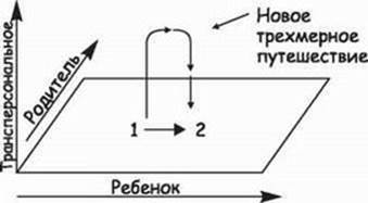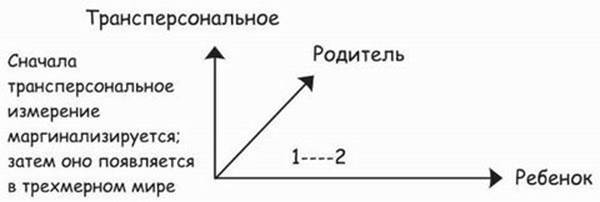 Люди, мыслящие в двух измерениях, в жизни легко теряются; им кажется, что они заперты в двухмерной идентичности родитель-ребенок. Они могут двигаться только в двух измерениях, соответствующих ролям родителя и ребенка. С внешней точки зрения, из мира более высокой размерности, мы могли бы сказать, что они не имеют доступа к другим измерениям. Возможно, именно поэтому люди впадают в депрессию или ищут чего-то, что подняло бы им настроение, – ищут методов, способных вести вверх или вниз. Если человек использует только два измерения, то не имеет ни глубины, ни высоты. Тут, возможно, был бы очень полезен священник. Он мог бы сказать: «Обратись к своему богу. Бог – это третье измерение». Если бы такой человек пришел к психотерапевту, то, возможно, услышал бы от него: «Вы застряли в двухмерной Вселенной». Терапевт мог бы добавить третье измерение, посоветовав: «Следуйте своим сновидениям, поскольку там вы найдете процессы, которые выходят за пределы ваших измерений ОР, проблем и решений в вашем мире». В сновидениях есть нечто большее, чем ребенок и жестокий родитель. Возможно, там есть добрая королева, лягушка, богиня или бог. Возможно, там – ничто, пустота. До сих пор это третье измерение подвергалось маргинализации. Оно существовало, но оставалось незамеченным. Когда человек меняется, к осознанию добавляется новое измерение. Мы можем представить добавление нового измерения, как показано на рис. 22.4.