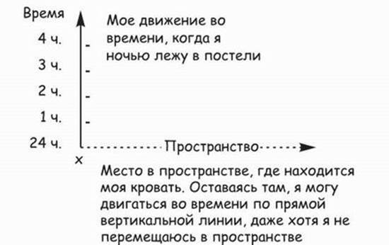 Теория относительности рассматривает движение в пространстве и во времени, тогда как в общепринятой реальности понятие движения обычно относится только к перемещению в пространстве. Большинство из нас согласятся, что в ОР двигаться означает, например, танцевать в комнате или ходить – все это движения в пространстве. Давайте рассмотрим и движение во времени. Например, представьте себе, что я домосед, который все время сидит и смотрит телевизор. Двигаюсь ли я во времени? Да, двигаюсь. Двигаюсь ли я, когда ночью лежу в постели? Я двигаюсь во времени. Большинство людей скажут, что я не двигаюсь в пространстве, когда сплю, – если не учитывать того, что я дышу и ворочаюсь в постели. Но даже будучи неподвижным, я все равно двигаюсь во времени.