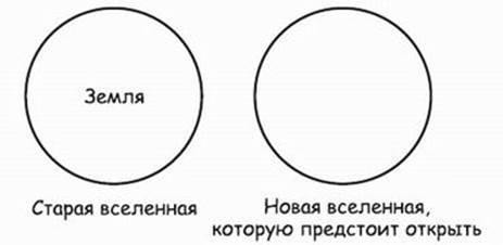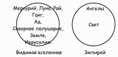 Упрощенный вариант четырехмерной Вселенной Римана можно представлять себе как сферу с двумя сторонами (рис. 29.1). Слева показана старая Вселенная Римана – известный мир с Землей посередине и Вселенной за ее пределами. Круг вокруг Земли представляет внешний предел того, как далеко мы можем видеть с помощью наших лучших телескопов. Сфера справа – это остальная Вселенная Римана (снова показанная в двух измерениях); это Вселенная за пределами того, что мы сегодня можем видеть, и, значит, Вселенная, которую еще предстоит открыть. Вероятно, в следующем столетии мы сможем с помощью более сильных телескопов, чем у нас есть сейчас, видеть большие участки этой «новой Вселенной»2. Данте тоже представлял себе Вселенную из двух сфер (рис. 29.2). В центре одной сферы был известный мир – Земля. Внешний периметр этого мира соответствовал самому отдаленному, что можно было видеть в то время. За пределами известного мира лежал неведомый мир, Вселенная, изображенная справа. В центре новой Вселенной находился сияющий свет, называемый «эмпиреем», в окружении ангелов. В «Божественной комедии» герой Данте, ведомый своим духовным проводником, совершает воображаемое путешествие через Ад, Чистилище и Рай, в конце концов, достигая Эмпирея – жилища богов, источника чистого света или огня. Герой и его проводник вместе путешествуют из его дома к окраинам видимой Вселенной – периметру сферы, изображенной слева. Оттуда он заглядывает за край, в сферу Эмпирея – высшую Вселенную, сферу огня.