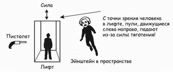 Примерно до 1910 года тяготение было просто концепцией; никто не знал, как оно действует. Даже сегодня оно все еще остается загадкой, и необходимы его дальнейшие исследования. Но в то время люди знали лишь то, что тяготение – это присущая все материи универсальная сила, которая заставляет массы притягиваться друг к другу1. В действительности, тяготение – самая «демократичная» из всех сил. Она не зависит от природы материи, ее цвета, электрического заряда, магнитной полярности, от того, твердая она или мягкая, большая или маленькая. Все другие силы в природе зависят от точной природы материи, на которую они действуют. Например, магнитные силы действуют только на магнитные материалы. Но тяготение – это общее свойство всей Вселенной, действующее на все виды материи. Но что оно собой представляет? Ученым известно, что вся материя обладает своего рода «упрямством», именуемым массой. Свойство части материи, называемое массой, обращаясь ко всей остальной Вселенной, говорит что-то вроде: «Позвольте мне двигаться по прямой, или я буду сопротивляться. Я сопротивляюсь, когда меня толкают или ускоряют. Коль скоро я двигаюсь посвоему пути, я буду оставаться на нем, пока вы не принуждаете меня поступать иначе!» Вот так примерно говорила бы масса, если бы могла разговаривать. Иными словами, вся материя обладает массой: чем больше масса, тем больше сопротивление ускорению и изменению. Что же касается природы массы, то мы можем лишь говорить, что она упряма и противится изменению[32]. Масса обладает инерцией, и для ускорения массы необходима сила. Большие планеты обладают большой массой, что означает сильное тяготение или эквивалентную ему большую кривизну пространства вокруг них. Чтобы лучше понимать связь между массой и кривизной, вернемся к нашим рисункам эксперимента с лифтом. На этот раз сделаем в стенке лифта отверстие, через которое могут пролетать пули, выпущенные из пистолета.