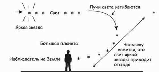 Свет старается следовать пространству; если пространство не искривлено, он движется по прямой линии. Но если лучи света искривляются, то, исходя из принципа эквивалентности, можно предполагать, что либо искривлено само пространство-время, либо поблизости есть большая планета, обладающая сильным тяготением. Что касается Эйнштейна, то он просто считал, что тяготение искривляет пространство-время.