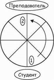 Рис. 41.8. Посредством смены ролей, дисбаланс положений ведет к динамической гармонии. (В то время как роли преподавателя и студента остаются относительно неизменными, люди, обозначенные цифрами 1 и 2, меняются ролями