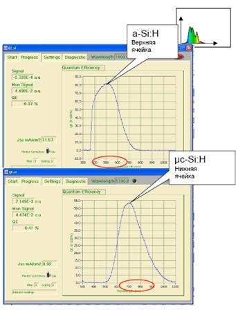 Для измерений на установке используются мини ячейки, изготавливаемые на стандартном оборудовании линии при использовании специальной программы скрайбирования и затем вырезаемые из подложки – см. предыдущий раздел. Спектральная характеристика (СХ, [мА/мВт]) это отношение фототока к энергии падающего монохроматического света как функция длины волны. Квантовая эффективность (КЭ) это отношение количества образовавшихся и зарегистрированных пар носителей заряда к количеству протонов при заданной длине волны. Взаимосвязь между величинами определяется формулой: Установка для измерения спектральных характеристик (квантовой эффективности) тонкопленочных фотовольтаических ячеек включает ксеноновый источник света, монохроматор, оптические фильтры, источник белого света, набор зеркал, фильтры рассеянного света. Оптическая система позволяет облучать образец одновременно монохроматическим измерительным лучом и так широкополосным лучом смещения. В качестве луча смещения используется белый свет или свет определенного цвета для изучения индивидуальных ячеек в тандемных структурах. Измерительный луч проходит через модулятор, частота которого согласована с частотой измерительного устройства. Таким образом эффект монохроматического света выделяется из общего вклада широкополосного луча и монохроматической добавки. Установка калибруется по эталонному фотодиоду, при этом измерение интенсивности света и определение отклика исследуемой ячейки производится одновременно. Установка оборудована программным обеспечением для управления и обработки данных. В частности возможна оценка тока холостого хода на основе свертки спектральной характеристики и конкретного спектра излучения. Измерения спектральных характеристик дают важную информацию о качестве фотовольтаических ячеек – эффективности рассеяния ППО, рекомбинационных и других потерях. Данные метода позволяют также определить области, где сосредоточены максимальные потери. Измерения для единичных ячеек стандартно проводятся в условиях нулевой разности потенциалов. Дополнительные измерения при обратном смещении (обычно -2В), то есть при усилении внутреннего поля в p-i-n структуре, позволяют оценить рекомбинационные потери (см. рис. 16). В случае тандемных структур метод позволяет определить спектральные характеристики индивидуальных ячеек (см. рис. 15) для обеспечения равенства тока в последовательно соединенных ячейках, то есть исключения ограничений по току. Для данного исследования тандемная ячейка облучается светом с подобранным спектральным составом, позволяющим создать в дополнительной (не измеряемой) ячейке насыщение по току. Таким образом, монохроматический свет воздействует только на измеряемую ячейку. При этом для создания нулевого потенциала на измеряемой ячейке к тандему прикладывается напряжение, обеспечивающее прямое смещение. Это необходимо для компенсации прямого смещения в дополнительной (не измеряемой) ячейке.