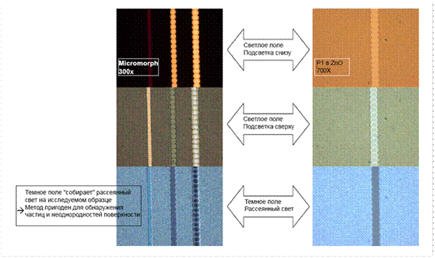 Рис. 30. Исследование под микроскопом при различных условиях освещения.