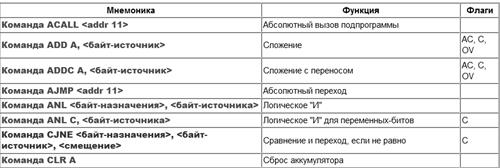 Система команд ОМЕВМ надає великі можливості обробки даних, забезпечує реалізацію логічних, арифметичних операцій, а також управління в режимі реаліного часу. Реалізована побітове, потетрадного (4 біти), побайтовая (8 біт) і 16-розрядна обробка даних. покажчиком (DPTR) і лічильником команд (РС). Слід зазначити, що регістр-покажчик даних може бути використаний як багатобайтових регістр DPTR або як два однобайтових регістра спеціального призначення DPH і DPL. Лічильник команд завжди використовується як багатобайтових регістр. · Арифметичні команди; · Логічні команди; · Команди передачі даних; · Команди бітового процесора; · Команди розгалуження та передачі управління.