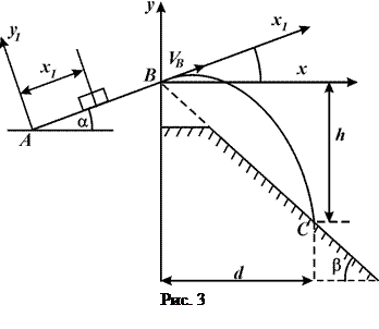 Приклад. Тіло рухається з точки похилої площини маючи початкову швидкість 12 м/с. Коефіцієнт тертя ковзання 0,1, кут нахилу площини до горизонту . Через 0,5 с тіло покидає похилу площину і падає на горизонтальну площину в точці (рис. 4).