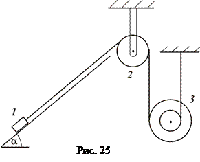 Визначити прискорення тіл та натяги мотузок, якими скріплені тіла механічної система (схеми приведені на рис. 25 - 30, маси тіл (кг), їх моменти інерції (кг.м 2 ), кути в градусах та розміри тіл, які входять до системи, відомі і наведені в таблиці 5). Тіла починають рухатись зі стану спокою під дією сил тяжіння. Кочення тіла 3 відбувається без ковзання. Коефіцієнт тертя ковзання між похилою площиною та тілом . Тертям кочення, силами опору у підшипниках та масою мотузок нехтувати. Мотузки вважати нерозтяжними.