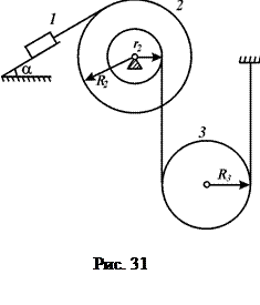 Приклад. Визначити прискорення тіл та натяги мотузок, якими скріплені тіла механічної система (рис. 31), яка починає рухатись зі стану спокою під дією сил тяжіння. Коефіцієнт тертя між похилою площиною та тілом - f. Маси, моменти інерції та розміри тіл, які входять до системи, відомі. Тертям кочення, силами опору у підшипниках та масою мотузок нехтувати.