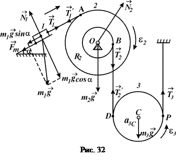 В цьому випадку тіло 2 буде обертатися за стрілкою годинника з певним кутовим прискоренням , тіло 3 буде здійснювати плоскопаралельний рух, обертаючись проти стрілки годинника з кутовим прискоренням , а його центр (вісь обертання блоку) буде рухатись вниз з лінійним прискоренням (рис. 32).