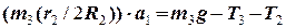 На друге діють: сили тяжіння , реакція осі блоку та натяги ниток та . Сума моментів цих сил відносно закріпленої осі зумовлює обертальний рух другого тіла. Оскільки момент сили відносно осі блоку дорівнює нулю, рівняння обертального руху тіла 2 набуває вигляду