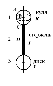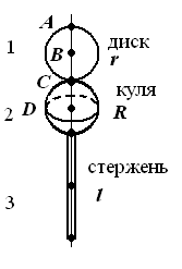 Визначити період коливань фізичного маятника (рис. 34 - 42). Маси (в кг) та геометричні розміри елементів маятника (в м) наведені в таблиці 6. Таблиця 6 Вихідні дані для задачі ДС.6