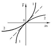 Разом з тим бiльш точно закон Гука записується так: Fx =- c 1 x- c 3 x 3 -c 5 x 5, (6.1) тобто, тут сила зростає швидше, нiж за лiнiйним законом; ця характеристика сили називається ”жорсткою”. Така характеристика спостерiгається у гуми (крива 1-1 рис. 6.1). Iнакше закон Гука записується так: Fx =- c 1 x + c 3 x 3 + c 5 x 5, (6.2)