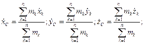 В (11.3) xk, yk, zk - координати k -тої матерiальної точки. При безперервному розподiлi мас суми в правiй частинi формул (11.3) переходять у вiдповiднi iнтеграли. Центр мас твердого тiла, що знаходиться в однорiдному полi сили тяжiння, спiвпадає з центром ваги. При визначеннi центра мас механiчної системи можна користуватися методами, якi встановленi в статицi для визначення центра ваги (метод симетрiї, метод роздiлення на частини, метод вiд’ємних мас i т. д.) В динамiцi слiд говорити про центр мас механiчної системи, а не про центр ваги. Необхiдно вiдмiтити, що положення центра мас твердого тiла не змiнюється вiдносно точок тiла. Якщо ж система складається з точок, якi перемiщуються одна вiдносно iншої, то положення центра мас системи вiдносно її точок може змiнюватись. Залежнiсть мiж швидкiстю центра мас i швидкостями точок матерiальної системи має вигляд: