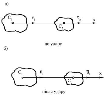 Удар двох тіл, при якому спільна нормаль до поверхонь тіл в точці дотику проходить через їх центри мас, а швидкості центрів мас тіл на початку удару направлені по цій спільній нормалі, називається прямим центральним ударом. Розглянемо прямий центральний удар двох тіл з масами m 1 і m 2, що рухаються поступально (рис. 20.3). Позначимо швидкості центрів мас тіл до удару через Якщо друге тіло знаходиться попереду першого і Задача про прямий центральний удар двох тіл полягає в тому, щоб, знаючи маси тіл, швидкості центрів мас тіл на початку удару і коефіцієнт відновлення, визначити, по-перше, швидкості центрів мас тіл в кінці удару і, по-друге, ударний імпульс. Для розв’язання цієї задачі застосовуємо теорему про зміну кількості руху системи двох тіл: