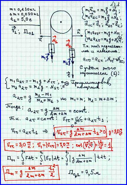 На неподвижном невесомом блоке уравновешены два груза массами по 0,230 кг. С каким ускорением будут двигаться грузы, если на один из них положить перегрузок массой 0,030 кг? Каковы скорости грузов через 5,0 с после начала движения? Какой путь пройдет каждый груз за это время? Нить считать невесомой и нерастяжимой?