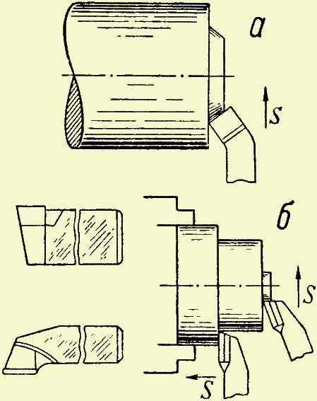 Подрезание в центрах: а — подрезной резец; б — подрезание торца с полуцентром. Его лучше употреблять при точении детали в центрах. Для того, чтобы торец можно было обрабатывать целиком, в заднюю бабку вставляется так называемый полуцентр. Если деталь закреплена только одним своим концом — при обработке в патроне, — то для проточки торца может быть использован и проходной отогнутый резец. Для этой же цели и для проточки уступов используются и специальные подрезные упорные резцы, которые работают с поперечной и с продольной подачей.