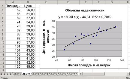 Уравнение аппроксимации Y = 0,2092х + 18,67 можно переписать в виде: Предсказанная цена = 18,67 + 0,2092* Площадь. Величина смещения по Y или постоянного члена в уравнении равна 18,67 и измеряется в тех же единицах, что и переменная Y. Величина 0,2092 является мерой наклона линии регрессии. Она показывает среднее изменение переменной Y при единичном изменении переменной X. Одним из самых распространенных способов ответить на вопрос «Насколько хорошо приближение» является исследование значения коэффициента детерминации (R2). Здесь значение R2 равно 0,679 и показывает, что примерно 68% колебаний стоимости от жилой площади может быть выражено линейной моделью. Возможно, остальные 32% колебаний могут быть выражены через другие параметры объектов в регрессионной модели с многими параметрами. Для определения величины прогнозируемой цены «вперед» или «назад» выполните следующее. Активизируйте область построения диаграммы или выделите точки на диаграмме. В пункте меню «Диаграмма» (этот пункт появляется в главном меню, когда активизировано окно диаграммы) выберите «Добавить линию тренда» или тот же пункт выберите в контекстном меню, щелкнув правой кнопкой по любой точке диаграммы. В появившемся окне «Линия тренда» выделите пункт «Параметры», в окне которого укажите задание на прогнозирование цены объекта недвижимости. Прогнозируемая величина появится на диаграмме. Далее рассмотрим нелинейный тип линии тренда. По изложенной выше методике постройте точечную диаграмму по данным таблицы 1. Затем при добавлении линии тренда в окне «Линия тренда» выберите, допустим, тип - «Логарифмическая». При этом следует иметь в виду, что свойства алгоритма предписывают, чтобы значения независимой переменной были положительными. Если же среди значений X имеются нулевые или отрицательные значения, то при добавлении линии тренда пиктограмма «Логарифмическая» на вкладке «Линия тренда» будет недоступна. Чтобы обойти это ограничение, можно добавить какое-либо число ко всем X. Результаты построения точечной диаграммы и добавления логарифмической линии тренда приведены на рис. 1.2.