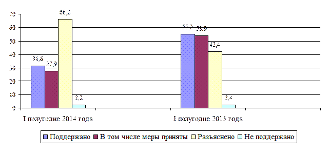 Наблюдается положительная динамика по итогам рассмотрения обращений граждан. Количество поддержанных заявлений по сравнению с I полугодием 2014 года увеличилось на 23,6%, число принятых мер – на 26%. Соответственно разъяснения граждане получили в I полугодии 2015 года в меньшем числе случаев, а конкретно на 23,8% реже, чем в I полугодии 2014. Объем неподержанных обращений увеличился незначительно - на 0,2%.