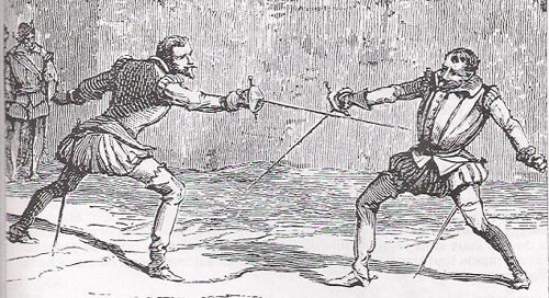 Поначалу бои на шпагах проходили с использованием специальных небольших щитов, которые назывались брокели. Кроме того, и сами щиты являлись опасным оружием, так как были снабжены шипами наподобие кинжалов. Таким щитом можно было наносить и колющие и рубящие удары. Да и сама шпага XV-XVII веков имела возможность для нанесения рубящих ударов. В XVI в. щит постепенно уступает место даге - специальному кинжалу. А в Испании вместо щита часто стали применять плащ, он наматывался на руку и использовался как щит или набрасывался на оружие или голову противника, отсюда и пошло знаменитое выражение "рыцари плаща и шпаги". Вскоре после изобретения французами правил дуэли, дуэльная лихорадка захлестнула всю Европу, и дуэль стала не способом сведения счетов, а лишь формой досуга. Во Франции при Генрихе III (1519-1559) и Генрихе IV (1553-1610) на дуэлях погибло больше дворянского населения, чем во время десятилетней гражданской войны. Поскольку дуэли предусматривали и поединки секундантов, очень часто они перерастали в настоящие бои, победителем в которых признавался тот, кто умирал последним. За проведение дуэлей короли стран грозили тюрьмой и смертными казнями, однако ничего не помогало. Естественно, большое количество людей, желающих обучиться фехтованию, требовали и большого количества учителей. Со временем учителя фехтования и профессиональные убийцы стали объединяться в братства. Первым из подобных братств был "Фехтовальный союз святого Марка", возникший в 1478 году во Франкфурте.