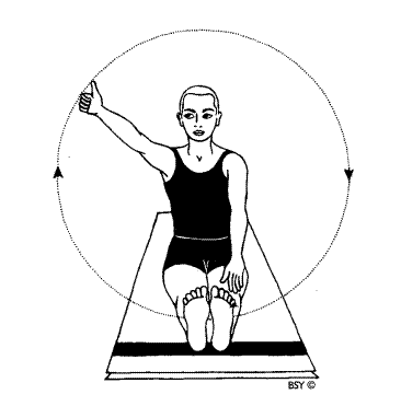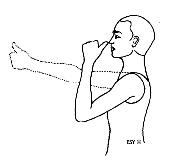 Упражнение 2: Боковое видение Займите сидячее положение с выпрямлеными ногами. Поднимите руки расставив их в стороны на ширине плеч, держите их прямо, большие пальцы направлены вверх. Не поворачивая голову, сфокусируйте свой взгляд в следующей последовательности: a) левый большой палец. b) межбровье (бхрумадхья) c) правый большой палец. d) междубровье e) левый большой палец. Повторите так от 15 до 20 раз, затем закройте глаза и дайте им отдохнуть. Несколько раз можно выполнить палминг.