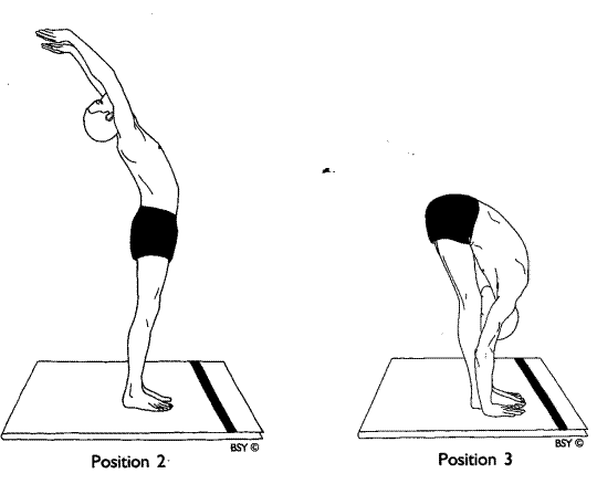 Позиция 5: Падахастасана (наклон вниз) Расслабьтесь, поставьте руки обратно на пол, рядом с левой стопой. Выдыхая поставьте правую стопу обратно, наклоняясь вниз. Ноги прямые. Лбом нужно постараться коснуться колен, как в упражнении 3.